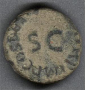 Moneda acuñada por el emperador Claudio I, mediante aprobación del Senado. Anverso con un modio de tres patas y la leyenda parcialmente visible "TI CLAVDIVS CAESAR AVG". Reverso con la inscripción "S C" y la leyenda parcialmente visible "(PON M) TR P IMP COS DES (IT)". Fabricada por acuñación a martillo, peso de 2,7 gr.