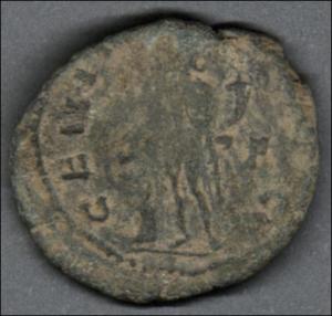 Moneda acuñada por el emperador Claudio II, el Gótico. Anverso con el busto radiado del emperador Claudio mirando a la derecha, leyenda "(IMP) C CLAVDIVS AV(G)" y borde de puntos. Reverso con un genio (espíritu protector) de pie a la izquierda, sosteniendo una pátera con la mano derecha sobre un altar a sus pies y sujetando una cornucopia con el brazo izquierdo, leyenda parcialmente visible "GENI(VS AVG)", "Γ" en el campo derecho y borde de puntos. Fabricada por acuñación a martillo, peso de 2,2, gr.