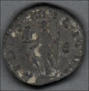 Moneda acuñada por el emperador Claudio II el Gótico. Anverso con el busto radiado del emperador Claudio II mriando a la derecha, leyenda "IMP CLAVDIVS (AV)G" y borde de puntos. Reverso con la diosa Fides drapeada de pie a la izquierda, sosteniendo un estandarte militar con la mano derecha y con la derecha, una lanza, leyenda "FIDES MILITVM", en el campo derecho "ϵ" y borde de puntos. Fabricada por acuñación a martillo, peso de 3,2 gr..