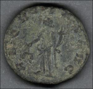 Moneda acuñada por el emperador Claudio II, el Gótico. Anverso con el busto radiado del emperador Claudio II drapeado y mirando a la derecha, leyenda "(IM)P C CLAVDIVS (AVG)" y borde de puntos. Reverso con la diosa Aequitas drapeada de pie a la izquierda, sosteniendo una balanza con la mano derecha y con la izquierda, una cornucopia, leyenda "AEQVITAS AVG" y borde de puntos, sin marcas de control. Fabricada por acuñación a martillo, peso de 3,1 gr.