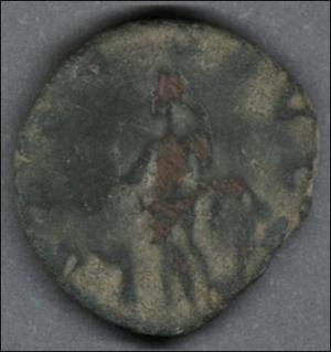 Moneda acuñada por el emperador Tétrico I en el llamado "Imperio galo", una de las escisiones del Imperio romano durante la crisis del siglo tercero. Anverso con el busto radiado del emperador Tétrico llevando coraza y mirando a la derecha, leyenda "(IM)P TETRICVS P F AVG" y borde de puntos. Reverso con la diosa Salus drapeada de pie alimentando a una serpiente que sale de un altar, leyenda "SALVS AVG". Fabricada por acuñación a martillo, peso de 2,7 gr.