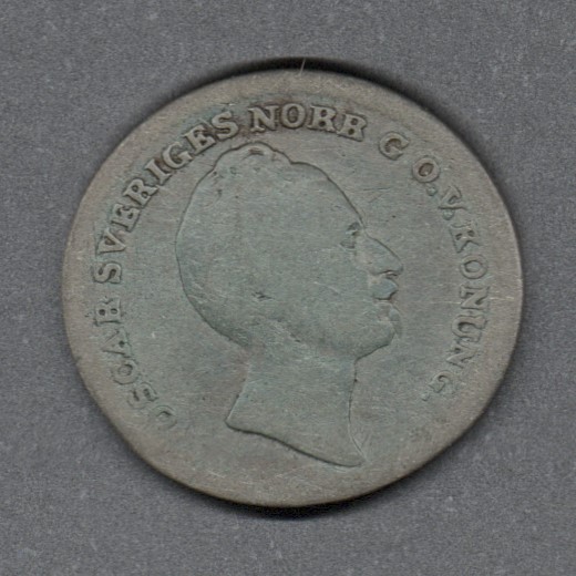 Monedas circulantes normales de Suecia. En anverso retrato del rey Oscar I mirando hacia la derecha. Leyenda alrededor del borde. En reverso escuedo de armas de Suecia coronadas y rodeadas por la Cadena de la Orden de los Serafines que divide el valor a los lados. Arriba está el lema del Rey ; mientras que abajo, está la fecha y la marca de ceca.