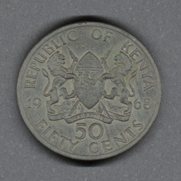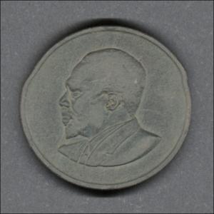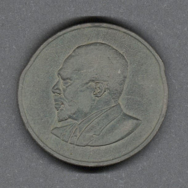Monedas circulantes normales de Kenia. En anverso escudo de armas de Kenia dividiendo la fecha. En reverso retrato del presidente Mzee Jomo Kenyatta mirando hacia la izquierda.