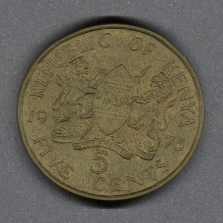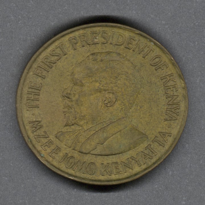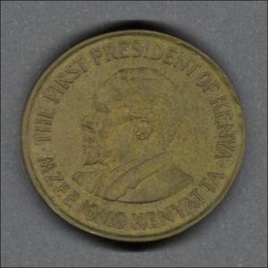 Monedas circulantes normales de Kenia. En anverso escudo de armas de Kenia dividiendo la fecha. En reverso retrato del presidente Mzee Jomo Kenyatta mirando hacia la izquierda. Leyenda alrededor del borde.