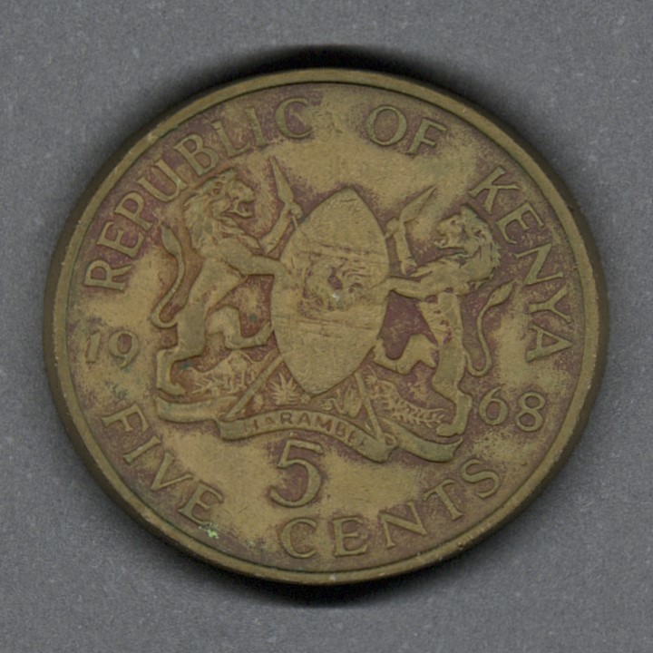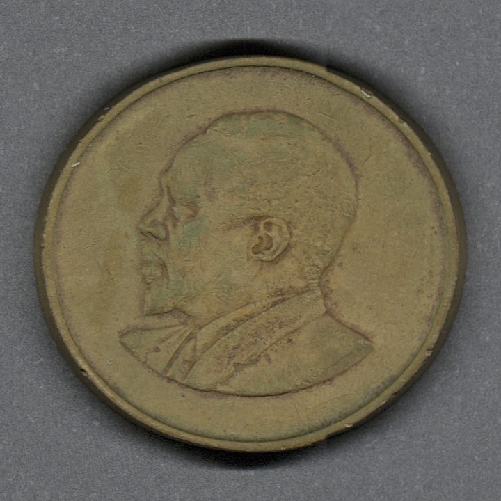 Monedas circulantes normales de Kenia. En anverso escudo de armas de Kenia dividiendo la fecha. En reverso retrato del presidente Mzee Jomo Kenyatta mirando hacia la izquierda. Sin leyenda.