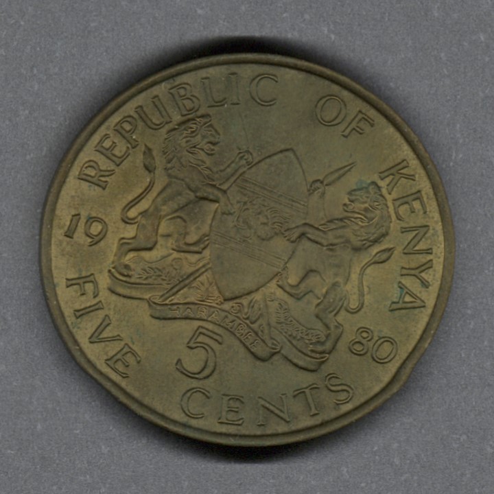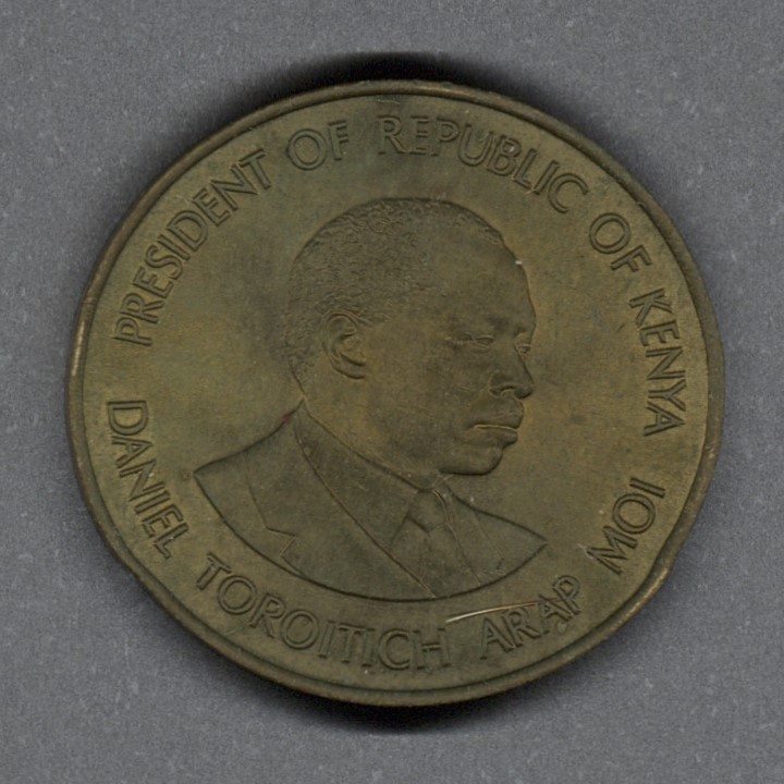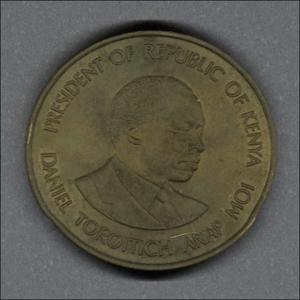 Monedas circulantes normales de Kenia. En anverso escudo de armas de Kenia dividiendo la fecha. En reverso retrato de Daniel Toroitich Arap Moi mirando hacia la derecha.
