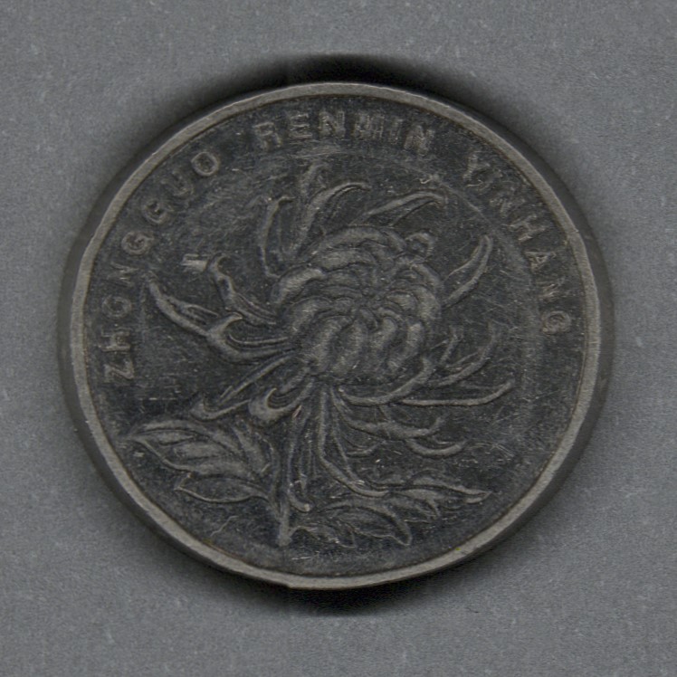 Monedas circulantes normales de China. En anverso nombre del banco, denominación, y año de emisión. En reverso flor de crisantemo y nombre del emisor en pinyin arriba.