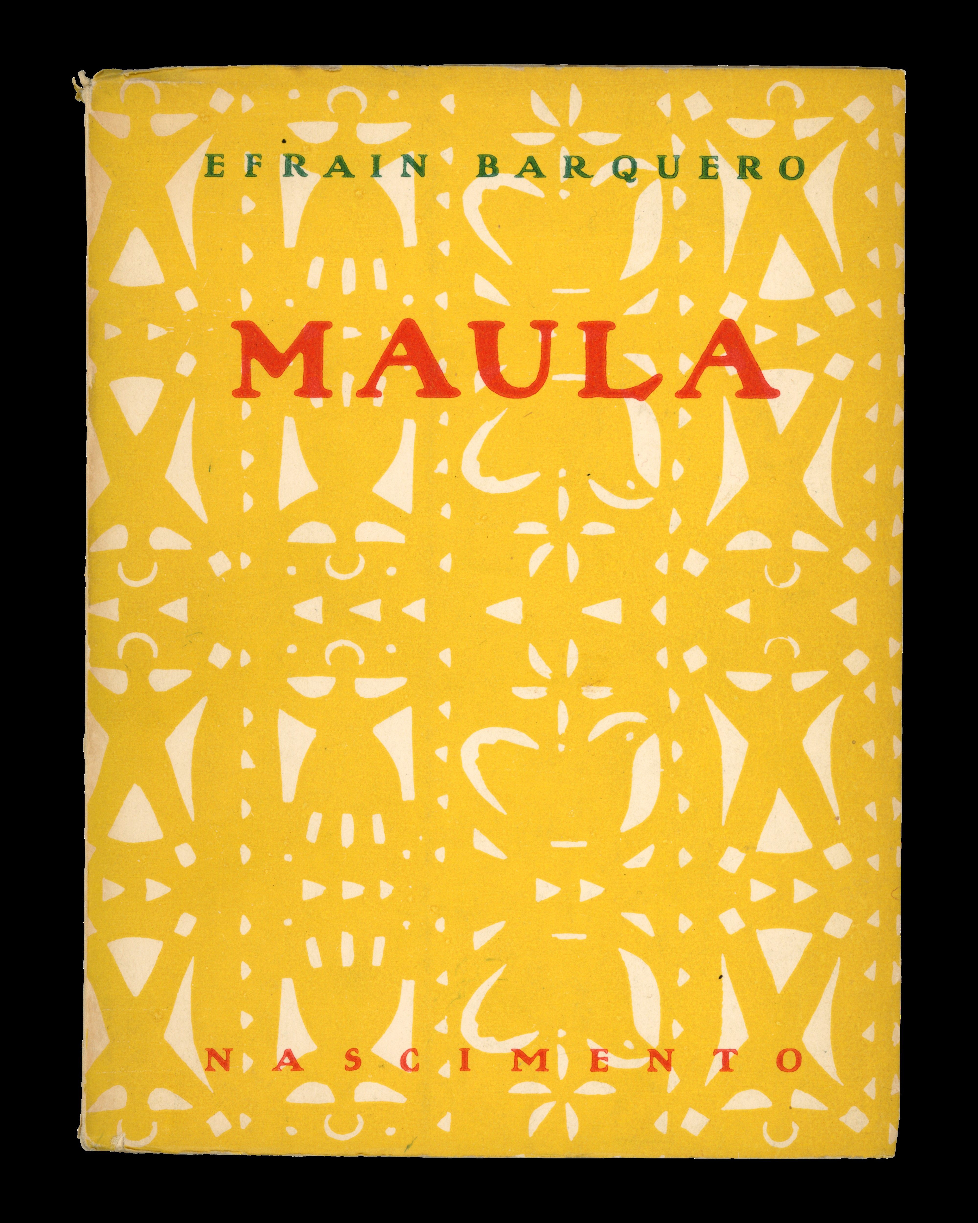 Portada ilustrada con un patrón repetitivo y simétrico en color amarillo intenso sobre blanco, compuesto por figuras abstractas que evocan formas humanas estilizadas o elementos orgánicos interconectados, dispuestos en filas y columnas. Sobre el diseño, detaca en caligrafía roja el título. Pertenece al libro de poesía Maula, de Efraín Barquero, publicado en 1962.
