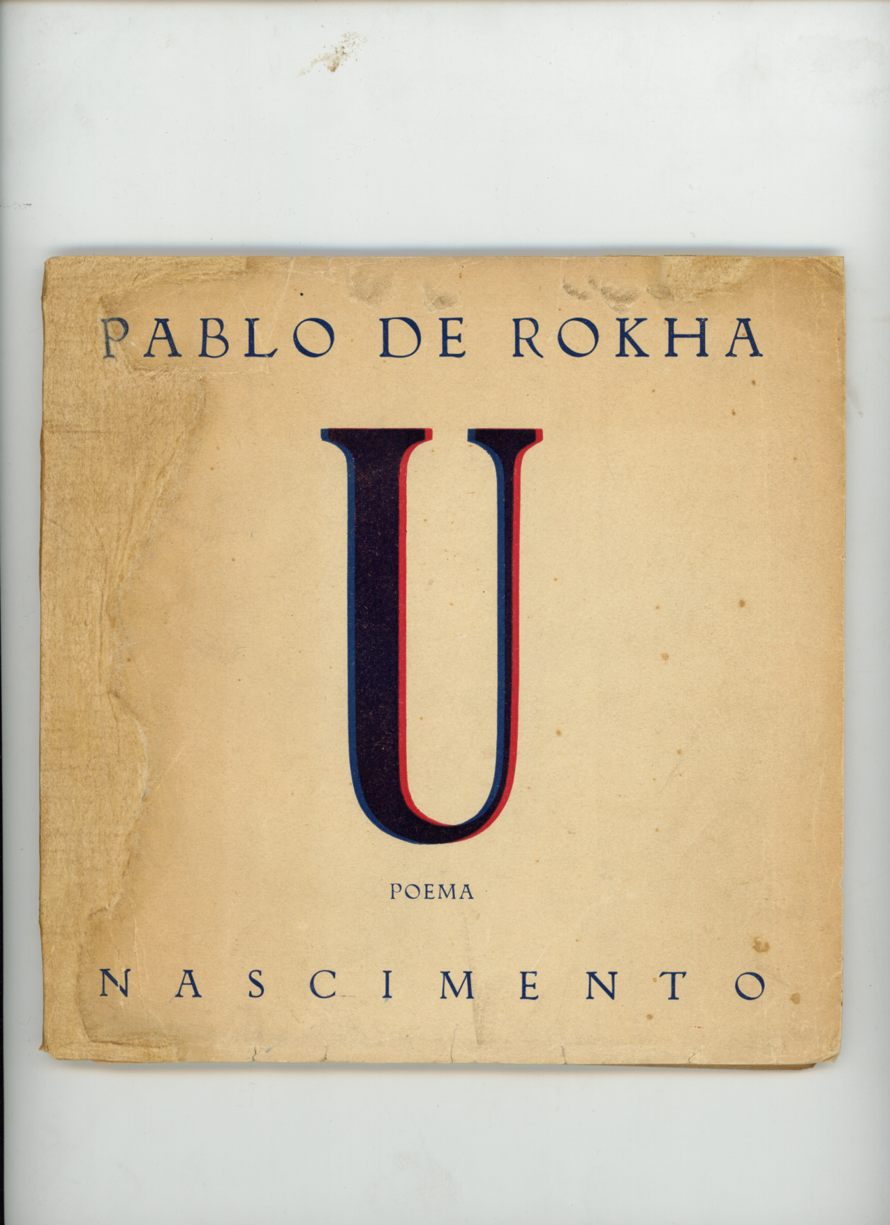 Portada de fondo ahuesado con el título, nombre del autor y editorial en caligrafía en negro. En el centro aparece una letra "U" de gran tamaño.Pertenece al libro U poema de Pablo de Rocka, publicado en 1926.
