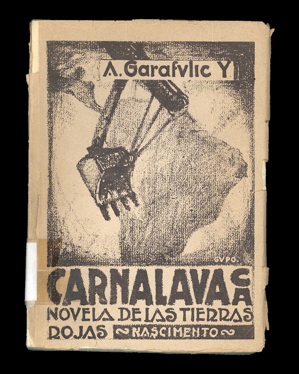 Portada ilustrada sobre un fondo ahuesado, en la que aparece una ilustración en color negro de trazos difuminados, con una garra excavadora contrapuesta a la silueta de Sudámerica. Pertenece a la novela Carnalavaca: novela de las tierras rojas, por Andrés Garafulic, publicada por la editorial en 1932.