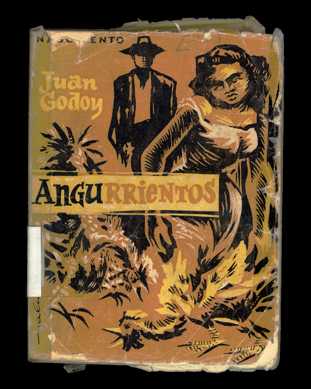 Portada ilustrada sobre un fondo café, en la que aparece una mujer de vestido blanco apoyada contra un árbol. A sus espaldas se encuentra un hombre vestido de negro y con un sombrero oscureciendo su rostro; a sus pies, una gallina alterada de color amarillo, con el cuello extendido, el pico abierto y las alas alzadas. Vegetación en blanco y negro completa el cuadro. El título atraviesa la portada, la mitad "Angu" en negro y "rrientos" en café. Pertenece a la novela Angurrientos de Juan Godoy, publicada por la editorial en 1959.
