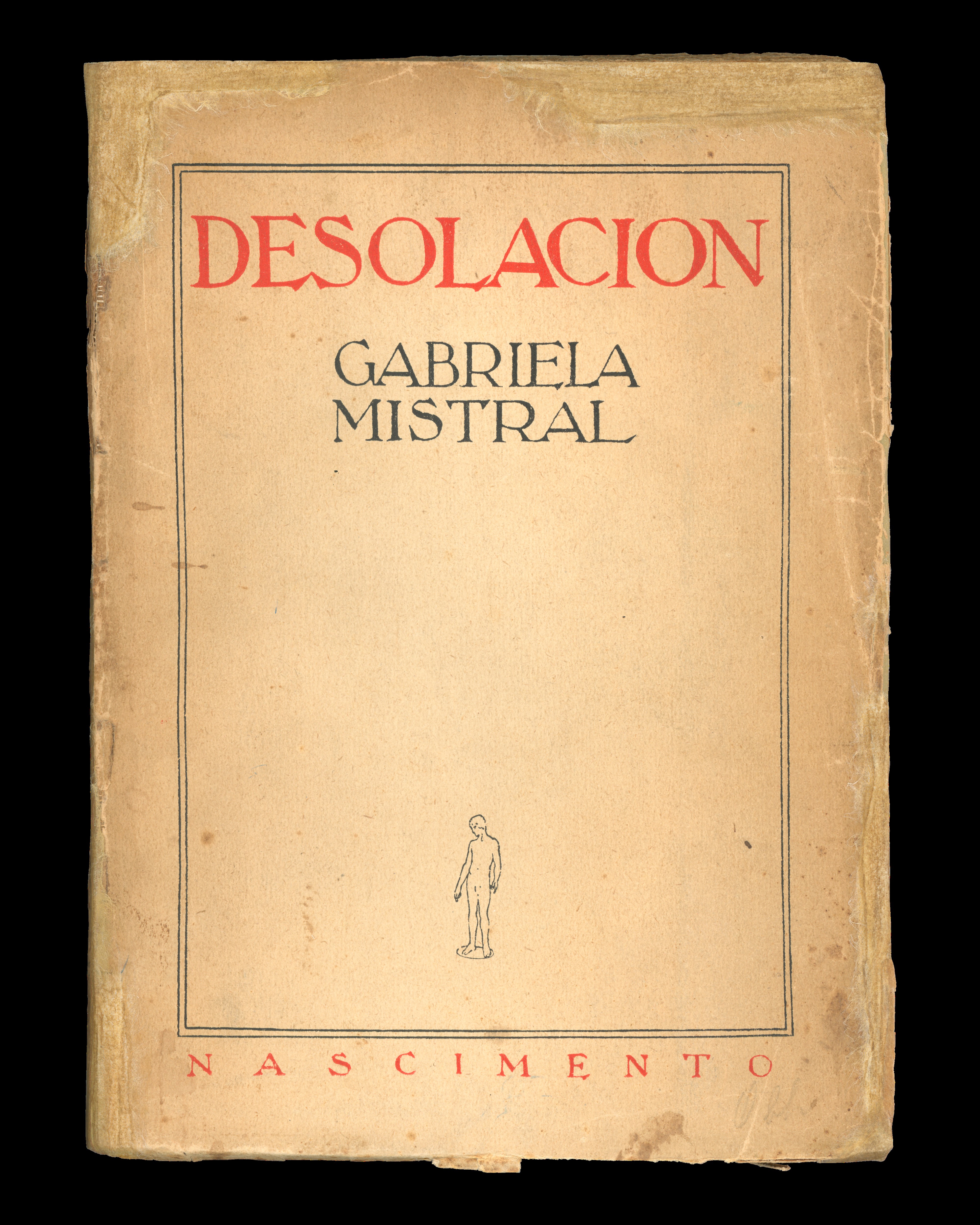 Portada ilustrada sobre un fondo ahuesado, en cuyo extremo inferior aparece la miniatura de una figura masculina. El título está en caligrafía roja. Pertenece al poemario Desolación de Gabriela Mistral, publicado en 1923 e impreso en los talleres gráficos de la editorial, en Arturo Prat 1430.