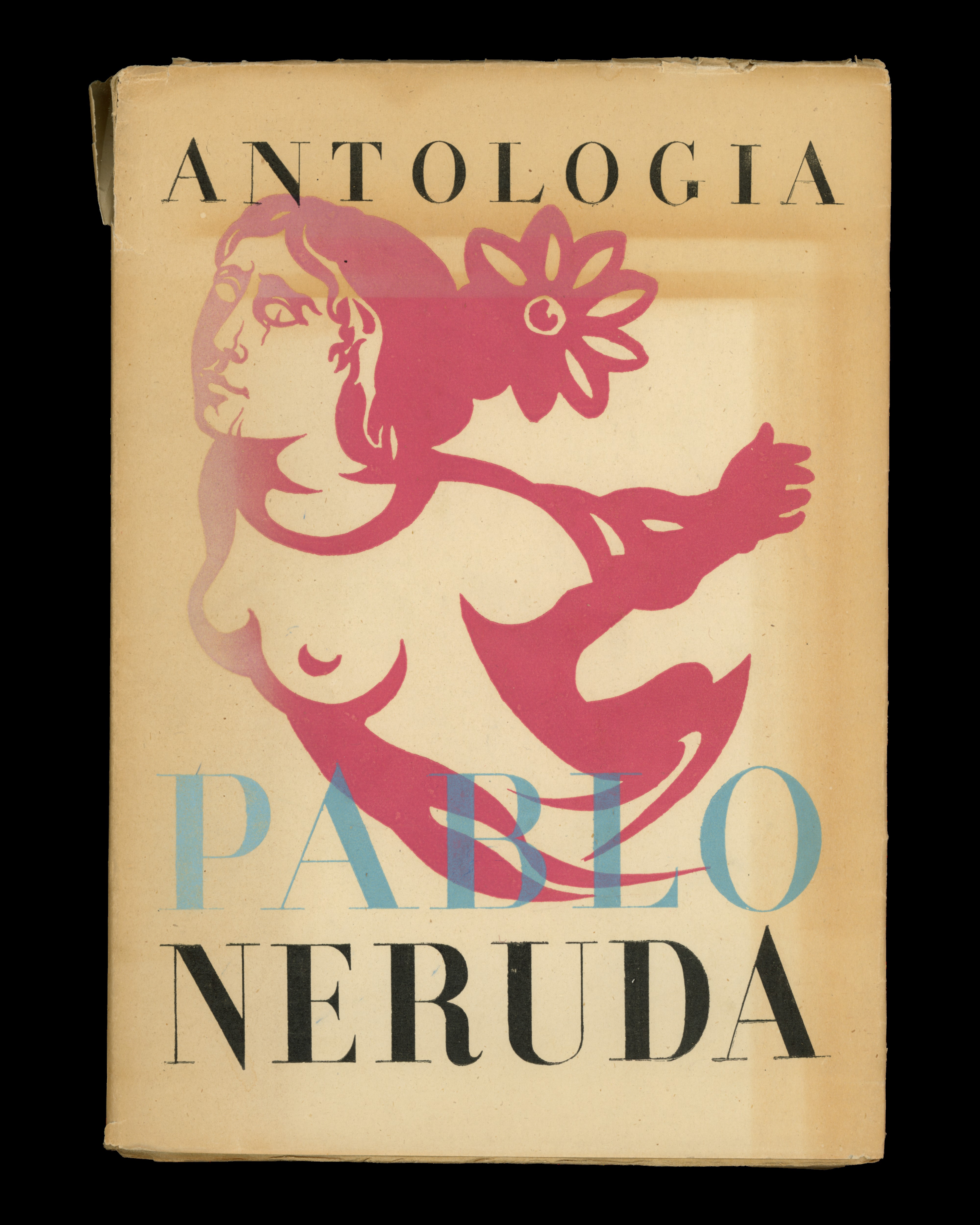 Portada ilustrada sobre un fondo ahuesado en la que aparece en color rojo la figura de una mujer con el torso desnudo.Su rostro está de perfil, mirando hacia la izquierda. En la parte de atrás de su cabeza se ve una flor grande con múltiples pétalos. Pertenece al libro Antología de Pablo Neruda, publicado en 1957.