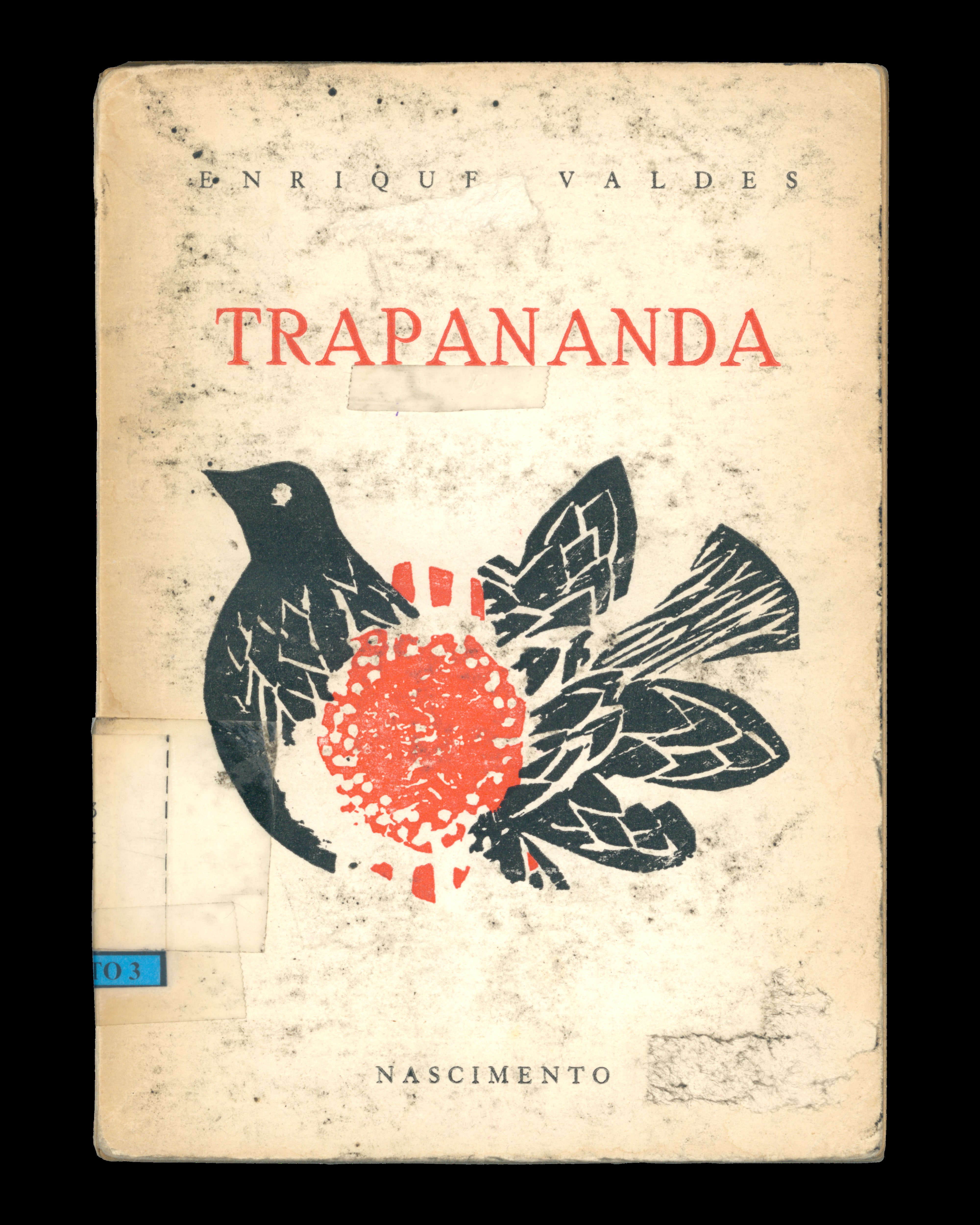 Portada ilustrada asobre un fondo ahuesado, en la que se encuentra un ave negra en cuyo centro se halla un círculo rojo. Pertenece al libro Trapananda de Enrique Valdés, publicado por la editorial en 1983.