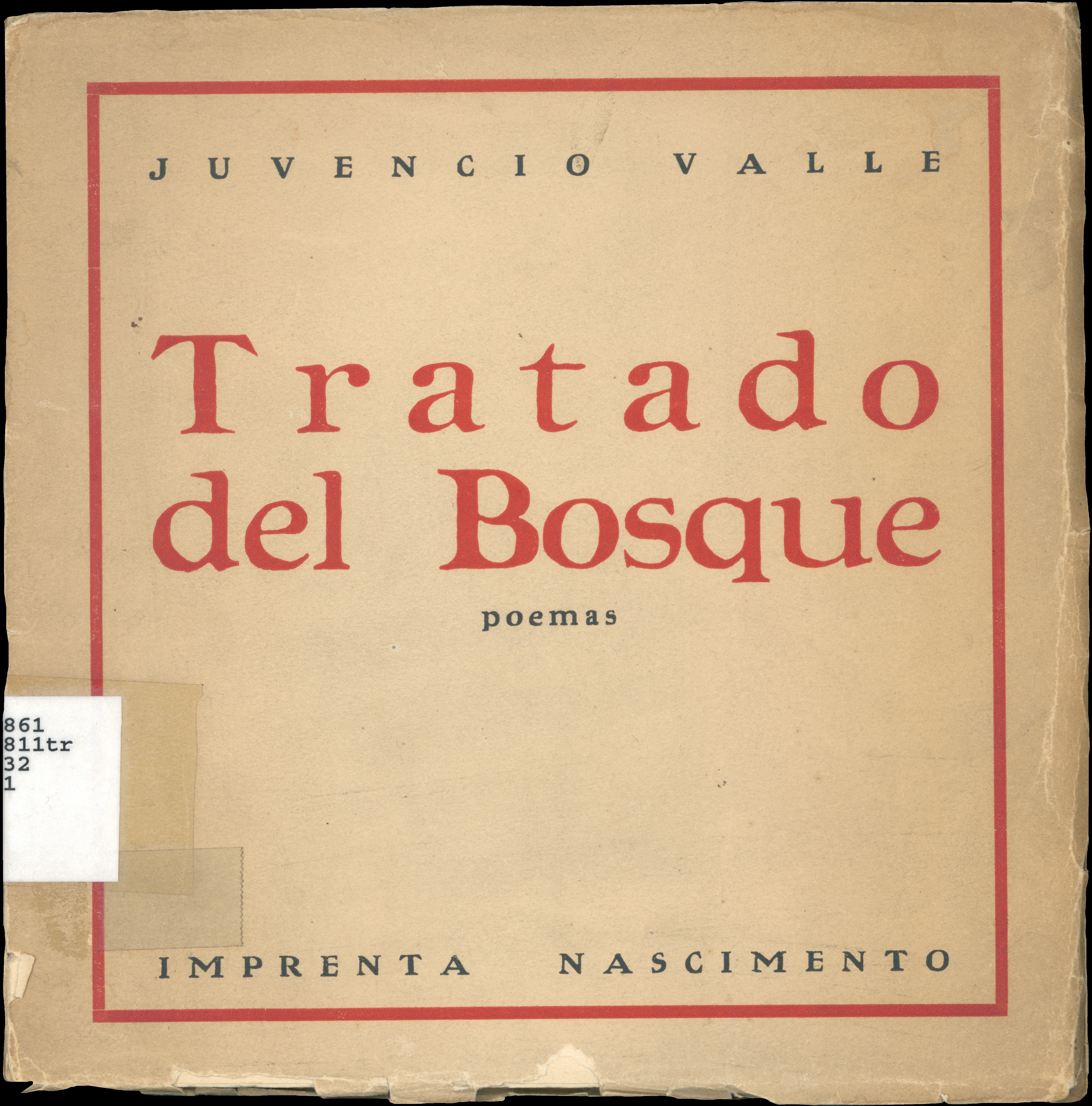 Portada de fondo ahuesado, enmarcada por una línea que forma un cuadrado en color rojo, al igual que la caligrafía del título. Pertenece al poemario Tratado del bosque de Juvencio Valle, publicado en 1932 e impreso en los talleres gráficos de la editorial, en Ahumada 125.