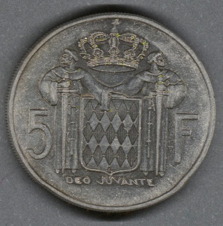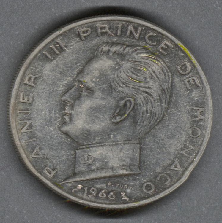 Moneda circulante normal de Mónaco. En anverso presenta busto de Rainiero III mirando a la izquierda, rodeado por leyenda "RAINIER III PRINCE DE MONACO". Al reverso escudo de armas con corona, flanqueado por simpatizantes y valor nominal. El grabador de ambas caras fue Pierre Turin. El diseño del canto es juncoso.