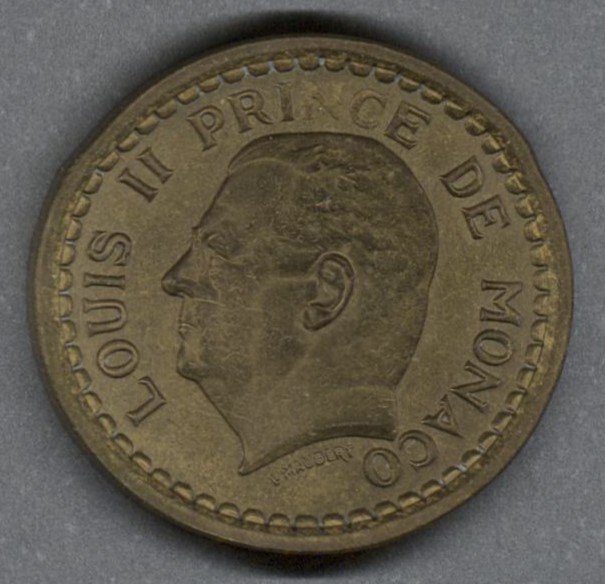 Moneda circulante normal de Mónaco. En anverso presenta busto de Luis II mirando a la izquierda, rodeado con la leyenda "LOUIS II PRINCE DE MONACO". Al reverso escudo de armas con corona y manto, flanqueados por valor abajo. El grabador de ambas caras fue Louis Maubert. El diseño del canto es llano.