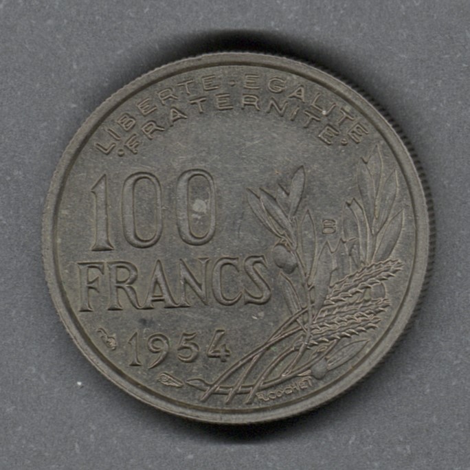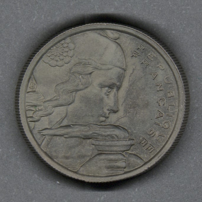 Moneda circulante normal de Francia. En anverso presenta busto de Libertad sosteniendo una antorcha mirando a la derecha. Al reverso valor y fecha con marca de ceca a la izquierda. Letras encima. Fruta y trigo a la derecha. Letra B. correspondiente a la marca de ceca, entre las ramas de olivo. El grabado de ambas caras estuvo a cargo de Robert Cochet. El diseño del canto es juncoso.