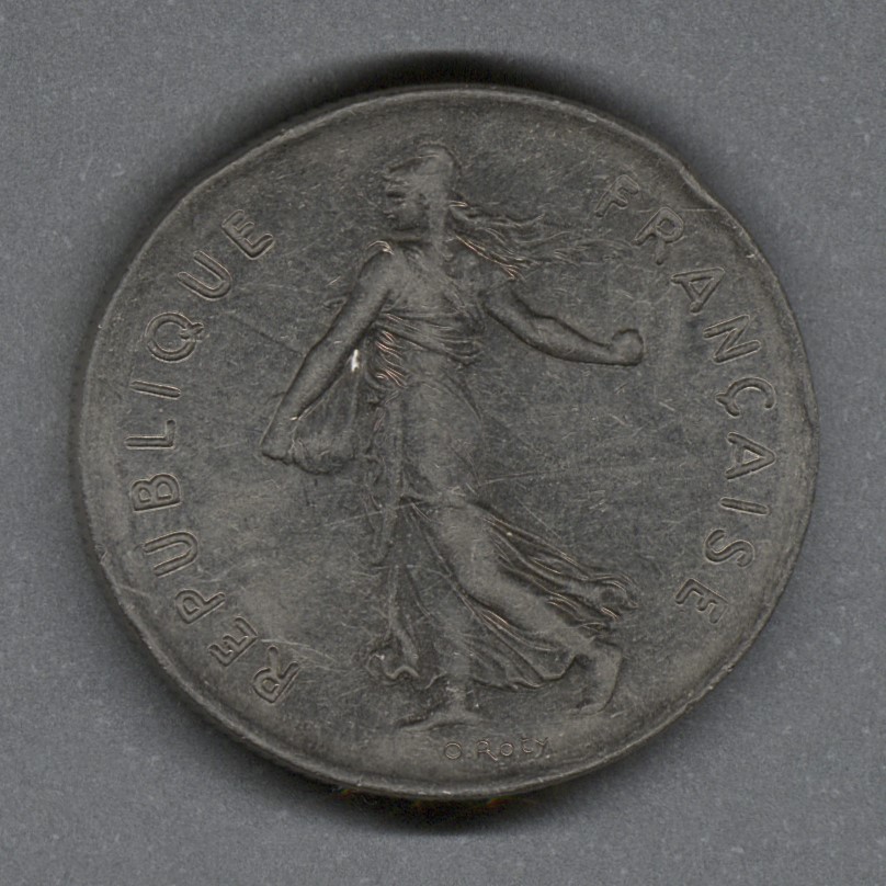 Moneda circulante normal de Francia. En anverso presenta imagen de El Sembrador, diseñado por Oscar Roty en 1900, emblema nacional de la República Francesa. Al reverso las ramas de olivo, las ramas de roble y las espigas de trigo, bajo el valor facial, están rodeadas por el lema francés. El grabador de ambas caras fue Louis-Oscar Roty. El diseño del canto es juncoso.