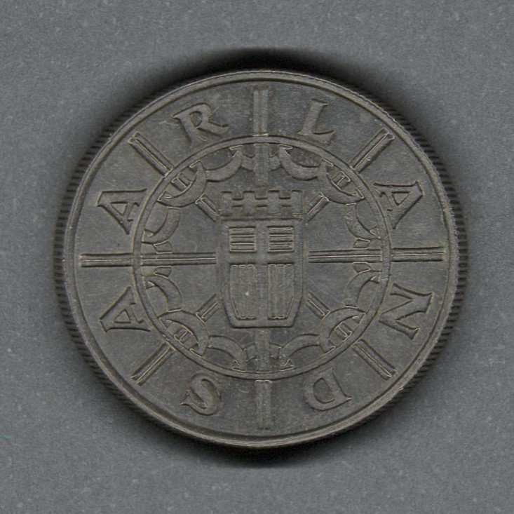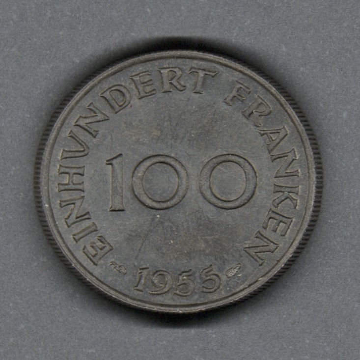Moneda circulante normal del Protectorado francés de Sarre (Alemania). En anverso presenta escudo de armas con diseño circular con líneas que tocan el borde, letras que componen la palabra SAARLAND en cada espacio formado con las líneas. Al reverso valor y fecha. El grabador de ambas caras fue Theo Siegle. El diseño del canto es juncoso.