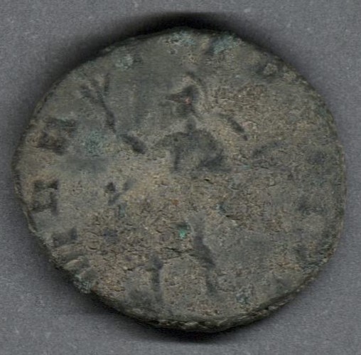 Moneda acuñada por el emperador Quintilo. Anverso con el busto radiado del emperador Quintilo drapeado sobre la coraza y leyenda parcialmente visible "(IMP C M AVR CL QVI)NTILLVS AVG". Reverso con Marte con caso y atuendo militar, avanzando a la izquierda, mientras sostiene una rama de olivo con la mano derecha y con la mano izquierda, el escudo y la lanza, leyenda parcialmente visible "MAR-TI P(ACIL)". Fabricada por acuñación a martillo, peso de 3,7 gr.