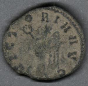 Moneda acuñada por el emperador Claudio II. Anverso con el busto radiado del emperador Claudio II llevando coraza y mirando a la derecha, leyenda "IMP C CLAVDIVS AVG" y borde de puntos. Reverso con la diosa Victoria drapeada a la izquierda, con las alas a la derecha, sosteniendo una guirnalda con la mano derecha levantada y con la izquierda, una hoja de palma sobre el hombro izquierdo, leyenda "VICT-ORIA AVG" y borde de puntos. Fabricada por acuñación a martillo, peso de 2,6 gr.