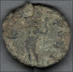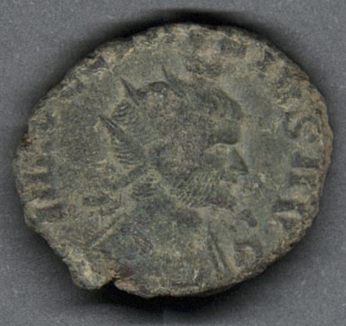 Moneda acuñada por el emperador Claudio II. Anverso con el busto radiado del emperador Claudio II llevando coraza y mirando a la derecha y leyenda "IMP C CLAVDIVS AVG". Reverso con el dios Júpiter de pie con una capa sobre los hombros a la izquierda, sosteniendo rayos con la mano derecha y con la izquierda, un cetro; leyenda parcialmente visible "(IOVI VIC)TORI". Fabricada por acuñación a martillo, peso de 2,8 gr.
