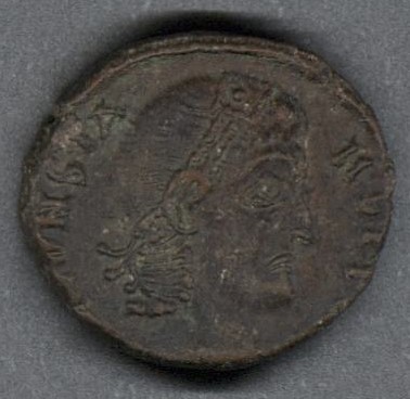 Moneda acuñada por el emperador Constante, como coemperador de su hermano Constancio II. Anverso conel busto del emperador Constante con diadema de perlas y mirando a la derecha, leyenda parcialmente visible "(D N CO)NSTA-NS (AVG)". Reverso con una corona de laurel con la inscripción "VOT / XV / MVLT / XX" y en el exergo "(S)MANΓI". Fabricada por acuñación a martillo, peso de 1,9 gr.