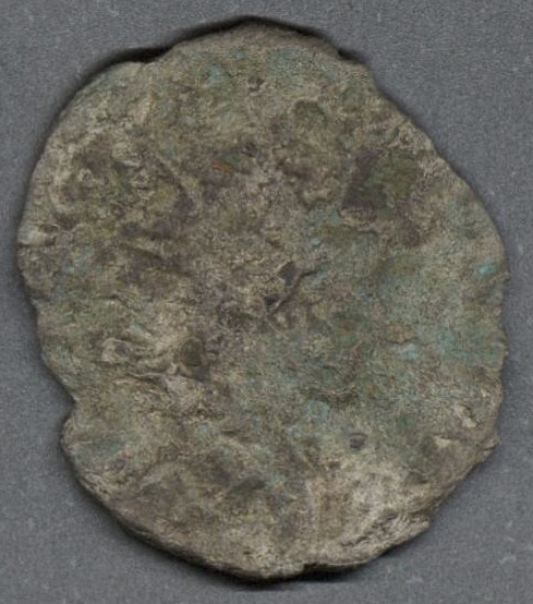 Pieza con desgaste general que impide una identificación, por lo que se sugiere mayor investigación. Se sugiere que es una pieza devaluada de mediados del s. III. Anverso con el busto radiado del emperador a la derecha y leyenda desgastada. Reverso con una figura femenina drapeada de pie a la izquierda, sin leyendas o marcas visibles. Fabricada por acuñación a martillo, peso de 1,8 gr.
