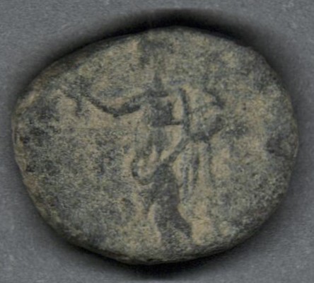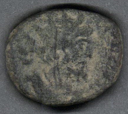 Pieza probablemente recortada (clipped) lo que no permite conocer las leyendas del anverso ni el reverso y la descripción propuesta es tentativa, se recomienda mayor investigación. Moneda probablemente acuñada en la segunda mitad del siglo III, el busto tiene semenjanzas con Tétrico I. Anverso con el busto radiado y con coraza del emperador, mirando a la derecha. Reverso con una diosa drapeada de pie a la izquierda, sosteniendo una rama en alto con la mano derecha y con la mano izquierda, afirmando su vestido. Fabricada por acuñación a martillo, peso de 2,7 gr.