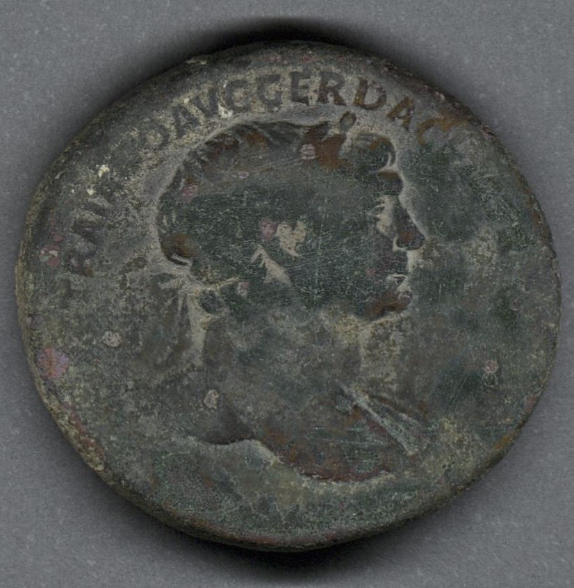 Pieza en estado de conservación regular, con desgaste por ambos lados, especialmente el reverso, lo que impide una identificación exacta y se propone una descripción tentativa. Moneda acuñada por el Senado en honor al emperador Trajano. Anverso con el busto laureado del emperador Trajano miradno a la derecha y drapeado sobre el hombro izquierdo, leyenda parcialmente visible "(IMP CAES NERVAE) TRAIANO AVG GER DAC (...)" y borde de puntos. Reverso completamente desgastado, salvo por un fragmento de la leyenda "(SPQR OPTIMO PR)INC(IPI) / S C". Fabricada por acuñación a martillo, peso de 23,3 gr.