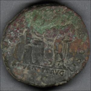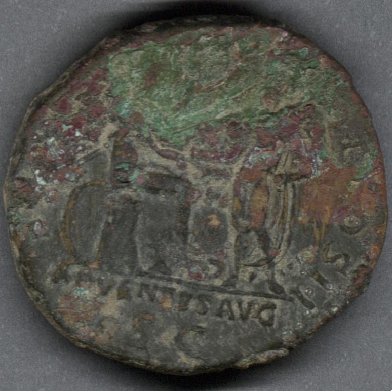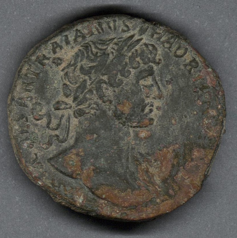 Pieza en estado de conservación regular que no impide su identificación. Moneda acuñada por el emperador Adriano, mediante aprobación del Senado. Anverso con el busto laureado del emperador Adriano mirando a la derecha y drapeado sobre el hombro izquierdo, leyenda parcialmente visible "(IMP CA)ESAR TRAIANVS HADRIANVS (AVG)" y borde de puntos. Reverso con la diosa Roma sentada sobre un escudo y coraza, mirando a la derecha, sosteniendo una lanza con la mano izquierda y dándole la mano derecha al emperador Adriano, togado, de pie y sosteniendo un rollo con la mano izquierda, leyenda parcialmente visible "(PONT MAX TR POT C)OS II", en el exergo "ADVENTVS AVG / S C" y borde de puntos. Fabricada por acuñación a martillo, peso de 17,8 gr.