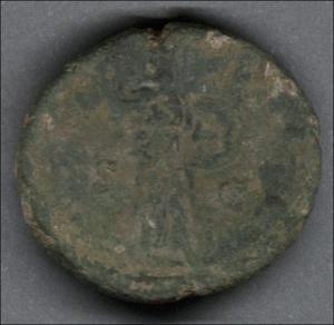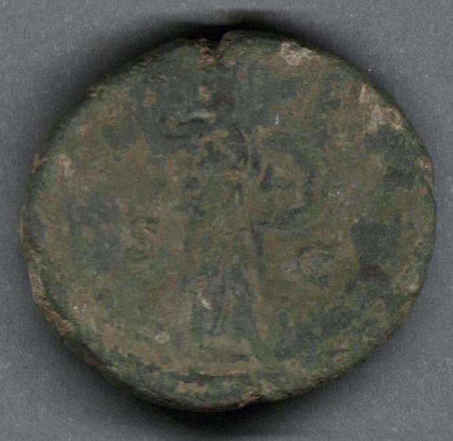 Pieza en estado de conservación regular, por lo que se propone una identificación tentativa a partir del tipo y se sugiere mayor investigación. Moneda fabricada por el emperador Adriano, mediante aprobación del Senado. Anverso con el busto laureado del emperador Adriano mirando a la derecha, leyenda desgastada "(HADRIANVS - AVG COS II P P)" y borde de puntos. Reverso con la diosa Minerva Prómacos drapeada y con casos, avanzando a la derecha, con la mano derecha apuntando una lanza sobre el hombro derecho y con la mano izquierda, sosteniendo un escudo redondo, "S C" en el campo y borde de puntos. Fabricada por acuñación a martillo, peso de 11,1 gr.