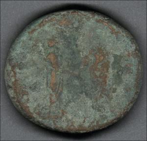 Pieza en estado de conservación regular, lo que impide su identificación exacta y se propone una descripción tentativa a partir del tipo, se sugiere mayor investigación. Moneda probablemente acuñada por el emperador Marco Aurelio o Lucio Vero, mediante aprobación del Senado. Anverso con el busto laureado del emperador mirando a la derecha, leyenda desgastada y borde de puntos. Reverso con dos hombres togados de pie, probablemente los emperadores, dándose la mano, leyenda desgastada y borde de puntos. Fabricada por acuñación a martillo, peso de 20,8 gr.