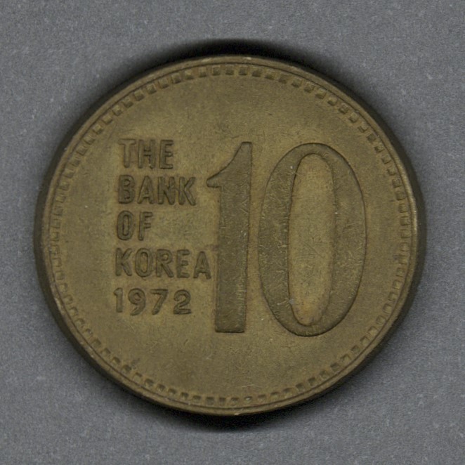 | Moneda de latón. Casa de monedas Korea Minting and Security Printing Corporation, Daejeon, Corea del Sur (1951-presente). |
