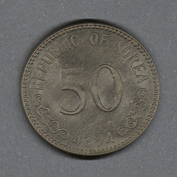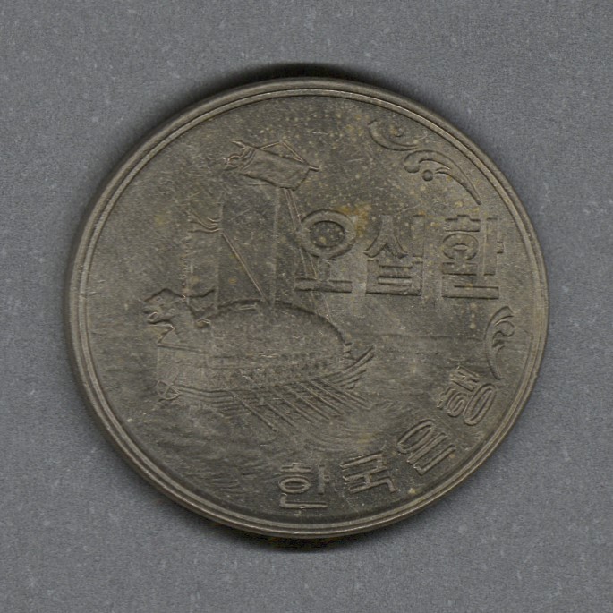 Monedas circulantes normales de Corea del Sur. En anverso valor y fecha según el calendario coreano (año 4294). En reverso geobukseon (barco tortuga), acorazado coreano utilizado entre los siglos XV y XIX, valor, título bancario (Hangul).