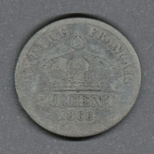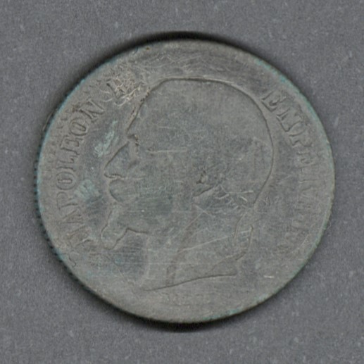 Moneda circulante normal de Francia. En anverso presenta retrato laureado de Napoleón III mirando hacia la izquierda, rodeado por la leyenda "NAPOLEON III EMPEREUR". Al reverso gran corona central, valor y fecha debajo. El grabador de ambas caras fue Albert Désiré Barre. El diseño del canto es juncoso.