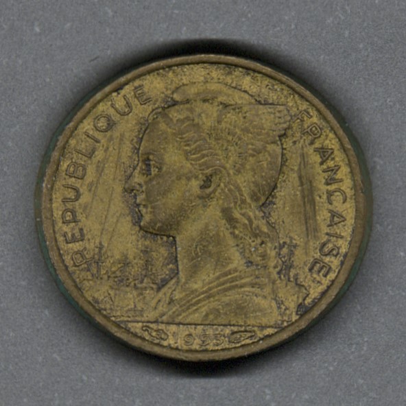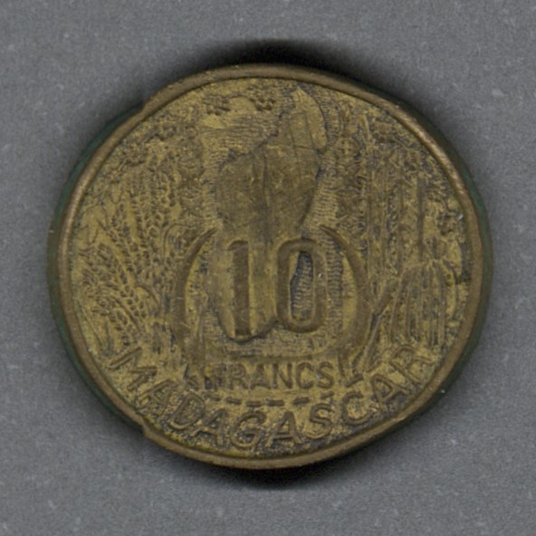 Moneda circulante normal de Madagascar. En anverso presenta personificación femenina de la República Francesa, con gorro frigio alado con el tricolor francés a la izquierda. Barcos de carga al fondo. Fecha debajo seguida de una marca privada. Al reverso valor dentro de los cuernos de un toro cebú flanqueado por un grupo de ramitas con un mapa del país sobre el valor. El grabador de ambas caras fue Lucien Georges Bazor, y el diseño del canto es llano.