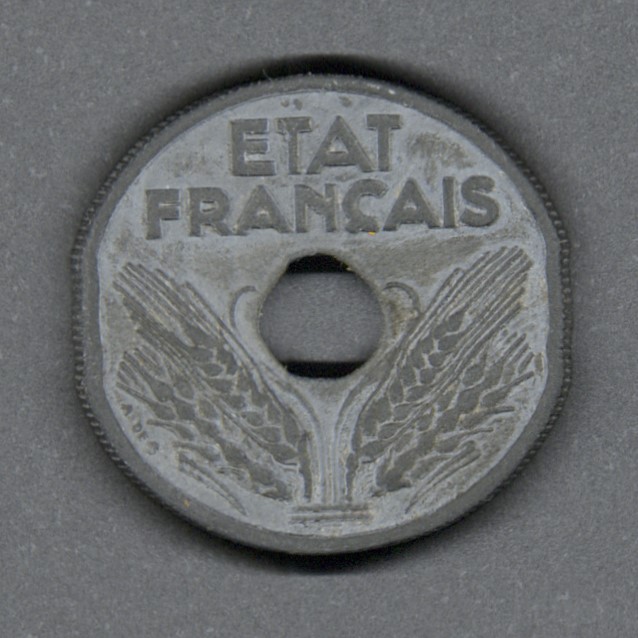 Moneda circulante normal de Francia. En anverso presenta ramas de trigo naciendo hacia ambos lados del agujero central y la leyenda "ETAT FRANÇAIS" sobre él. Al reverso hojas de roble a ambos lados del agujero. El diseño del canto es liso (con surcos estrechos o surcos anchos).