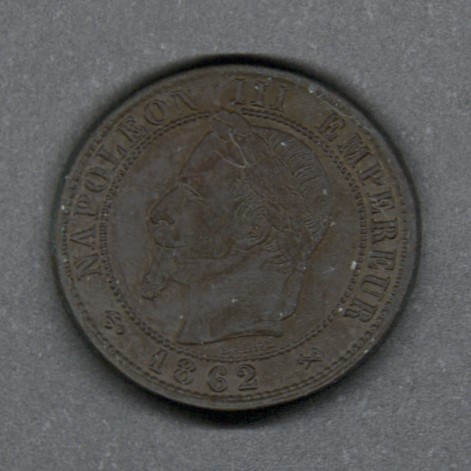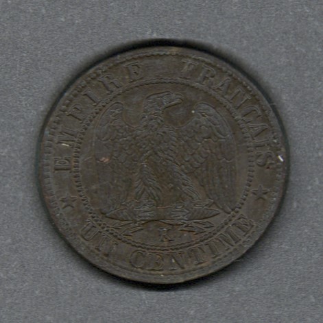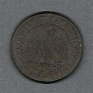 Moneda circulante normal de Francia. En anverso presenta cabeza laureada a la izquierda, rodeada por la leyenda "NAPOLEON III EMPEREUR", fue grabada por Albert Désiré Barre. Al reverso águila rodeada por leyenda "EMPIRE FRANÇAIS" y la denominación escrita en palabras, grabada por Jacques-Jean Barre. El diseño del canto es llano.
