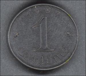 Moneda circulante normal de Francia. En anverso presenta una espiga de trigo rodeada de letras cursivas: "république française" (República Francesa). Al reverso el número "1" está rodeado por la fecha y la letra cursiva "céntimo". El diseñador de ambas caras fue Marcel Guilleminet, y el diseño del canto es llano.