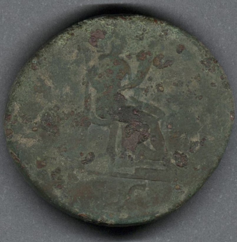 Pieza en estado de conservación regular, por lo que no es posible una identificación exacta, se propone una descripción tentativa a partir del tipo general y se sugiere mayor investigación. Moneda acuñada por el emperador Adriano, mediante aprobación del Senado. Anverso con el busto laureado del emperador Adriano mirando a la derecha; leyenda desgastada, posiblemente ("IMP CAESAR TRAIANVS HADRIANVS AVG P M TR P COS III") y borde de puntos. Reverso con la diosa Annona drapeada sentada a la derecha, sosteniendo una cornucopia con ambas manos, un modio con espigas en los pies, leyenda desgastada "(ANNONA AVGVSTI)", en el exergo "S C" y borde de puntos. Fabricada por acuñación a martillo, peso de 22,0 gr.