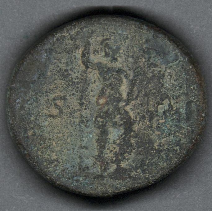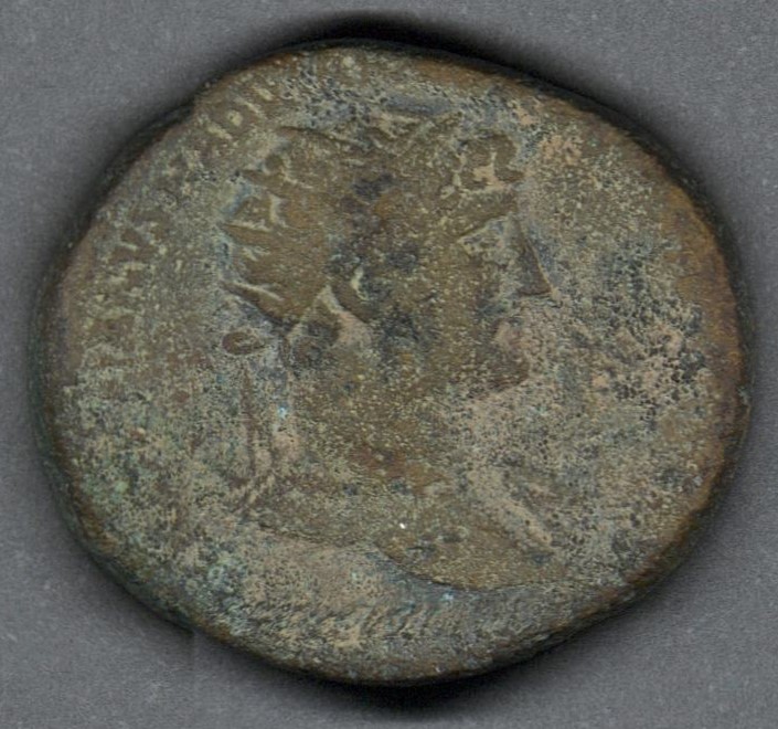 Pieza en estado de conservación regular, lo que no impide su identificación exacta. Moneda acuñada por el emperador Adriano, mediante aprobación del Senado. Anverso con el busto radiado del emperador Adriano mirando a la derecha, leyenda parcialmente visible "(IMP CAESAR TRAI)ANVS HADRI(ANVS AVG P M TR P COS III)" y borde de puntos. Reverso con la diosa Virtus de pie a la derecha, con el pie derecho sobre un casco, sujetando una lanza con la mano derecha y un parazonio con la izquierda, leyenda desgastada "(VIRTVTI AVGVSTI)", "S - (C)" en el campo y borde de puntos. Fabricada por acuñación a martillo, peso de 10,7 gr.