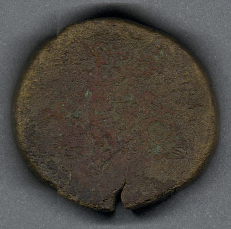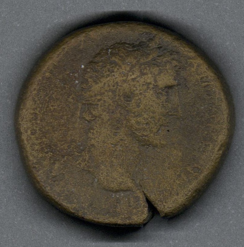 Pieza en mal estado de conservación, lo que impide su identificación exacta y se propone una descripción tentativa a partir del tipo visible, se sugiere mayor investigación. Moneda probablemente acuñada por el emperador Antonino Pío, mediante aprobación del Senado. Anverso con el busto laureado del emperador Antonino Pío mirando a la derecha y leyenda desgastada. Reverso con una figura masculina avanzando a la derecha con un trofeo sobre el hombro izquierdo y llevando una lanza, probablemente Rómulo o Marte y leyenda desgastada, "S C" insinuado en el campo y borde de puntos. Fabricada por acuñación a martillo, peso de 17,2 gr. peso muy reducido, posiblemente por el nivel de desgaste.