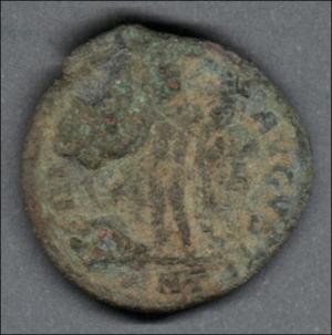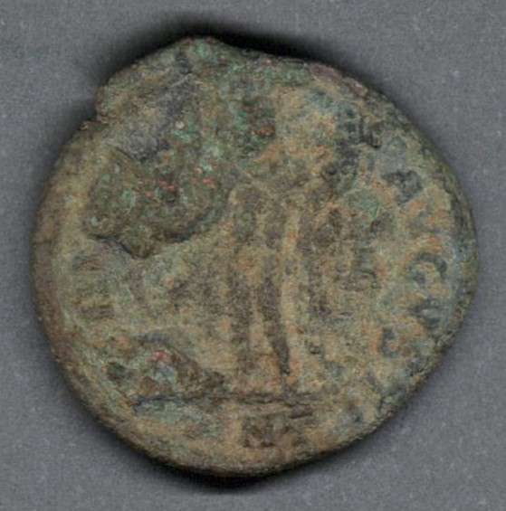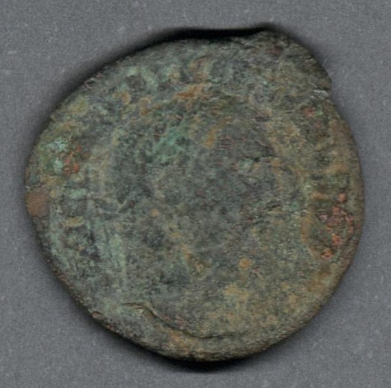 Pieza en estado de conservación regular, por lo que no es posible una identificación exacta, se propone una descripción tentativa a partir del tipo general y se sugiere mayor investigación. Moneda acuñada por el emperador Licinio I, en el contexto del colapso de la Tetrarquía. Anverso con el busto laureado del emperador Licinio a la derecha, leyenda parcialmente visible "IMP C L(IC) LICI(NIVS P F AVG)" y borde de puntos. Reverso con un genio (espíritu protector) de pie a la izquierda, sosteniendo una cornucopia con el brazo izquierdo, leyenda parcialmente visible "(GA)NIO - AVGVSTI", "✱" en el campo izquierdo, "A" en el campo derecho, "(A)NT" en el exergo y borde de puntos. Fabricada por acuñación a martillo, peso de 3,5 gr.