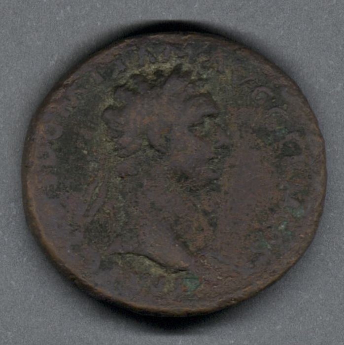 Pieza en estado de conservación regular, por lo que no es posible una identificación exacta, se propone una descripción tentativa a partir del tipo general y se sugiere mayor investigación. Moneda acuñada por el emperador Domiciano, mediante aprobación del Senado. Anverso con el busto laureado del emperador Domiciano a la derecha, leyenda parcialmente visible "IMP CAES DOMIT(IAN) AVG GERM COS (...)" y borde de puntos. Reverso con la diosa Moneta drapeada de pie a la izquierda, sujetando una balanza con la mano derecha extendida y con uan cornucopia con la izquierda, leyenda "MONETA - AVGVST", "S C" en el campo y borde de puntos. Fabricada por acuñación a martillo, peso de 9,8 gr.
