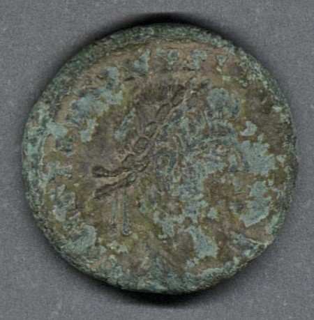 Pieza en estado de conservación regular, por lo que no es posible una identificación exacta, se propone una descripción tentativa a partir del tipo general y se sugiere mayor investigación. Moneda acuñada por el emperador Constantino I como Augusto o Constantino II como César. Anverso con el busto laureado del emperador drapeado sobre la coraza mirando a la derecha, leyenda parcialmente visible "(...) CONSTANTINVS (...)" y borde de puntos. Reverso con dos soldados de pie, sosteniendo una lanza y afirmándose en el escudo con dos estandartes entre ellos, leyenda parcialmente visible "GLOR-(IA EXERC-ITVS)", exergo "SMK" y borde de puntos. Fabricada por acuñación a martillo, peso de 2,4 gr.