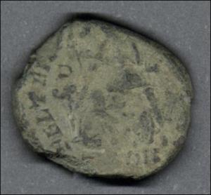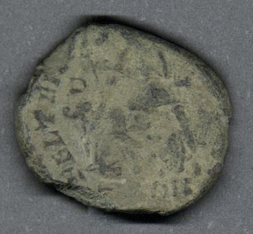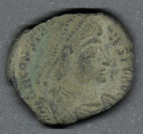 Pieza en estado de conservación regular, por lo que no es posible una identificación exacta, se propone una descripción tentativa a partir del tipo general y se sugiere mayor investigación. Moneda acuñada por el emperador Constancio II. Anverso con el busto del emperador Constancio II drapeado sobre la coraza, llevando diadema de perlas y mirando a la derecha, leyenda "D N CONSTAN-TIVS P F AVG" y borde de puntos. Reverso con un soldado lacerando a un "bárbaro" caído de un caballo, leyenda parcialmente visible "FEL TEM(P REPARATIO)", exergo pacialmente visible "(R)[guirnalda]B" y borde de puntos. Fabricada por acuñación a martillo, peso de 2,0 gr.