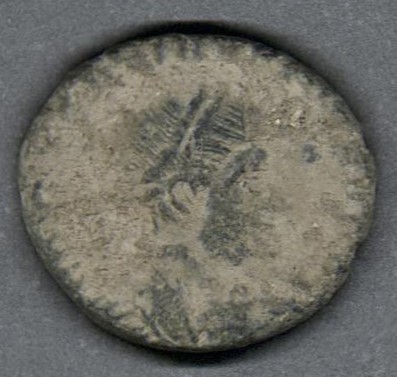 Pieza en estado de conservación regular, por lo que no es posible una identificación exacta, se propone una descripción tentativa a partir del tipo general y se sugiere mayor investigación. Moneda acuñada por la dinastía constantiniana, sustrato sobre la leyenda impide distinguir si es Constantino I, Constantino II, Constancio II, Constante o Dalmacio. Anverso con el busto laureado del emperador, llevando coraza y mirando a la derecha. Reverso con dos soldados de pie, sosteniendo una lanza y afirmados en un escudo, entre ellos un estandarte, leyenda no visible "(GLORIA EXERCITVS)". Fabricada por acuñación a martillo, peso de 0,7 gr.