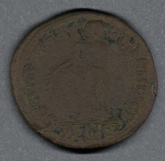 Pieza en estado de conservación regular, lo que no impide su identificación exacta. Moneda de bronce acuñada por el emperador Constantino I el Grande, en honor a su madre, la emperatriz Helena de Constantinopla. Anverso con el busto de la emperatriz Helena a la derecha con el cabello recogido y diadema, manto y collar, leyenda "FL HELENA - AVGVSTA". Reverso con la diosa Securitas drapaeada y de pie a la izquierda, sujetando su túnica con la mano derecha y levantando la mano izquierda con una rama de olivo, leyenda "SECVRITAS REIPVBLICE", en el exergo "R(guirnalda)Q". Fabricada por acuñación a martillo, peso de 2,8 gr.